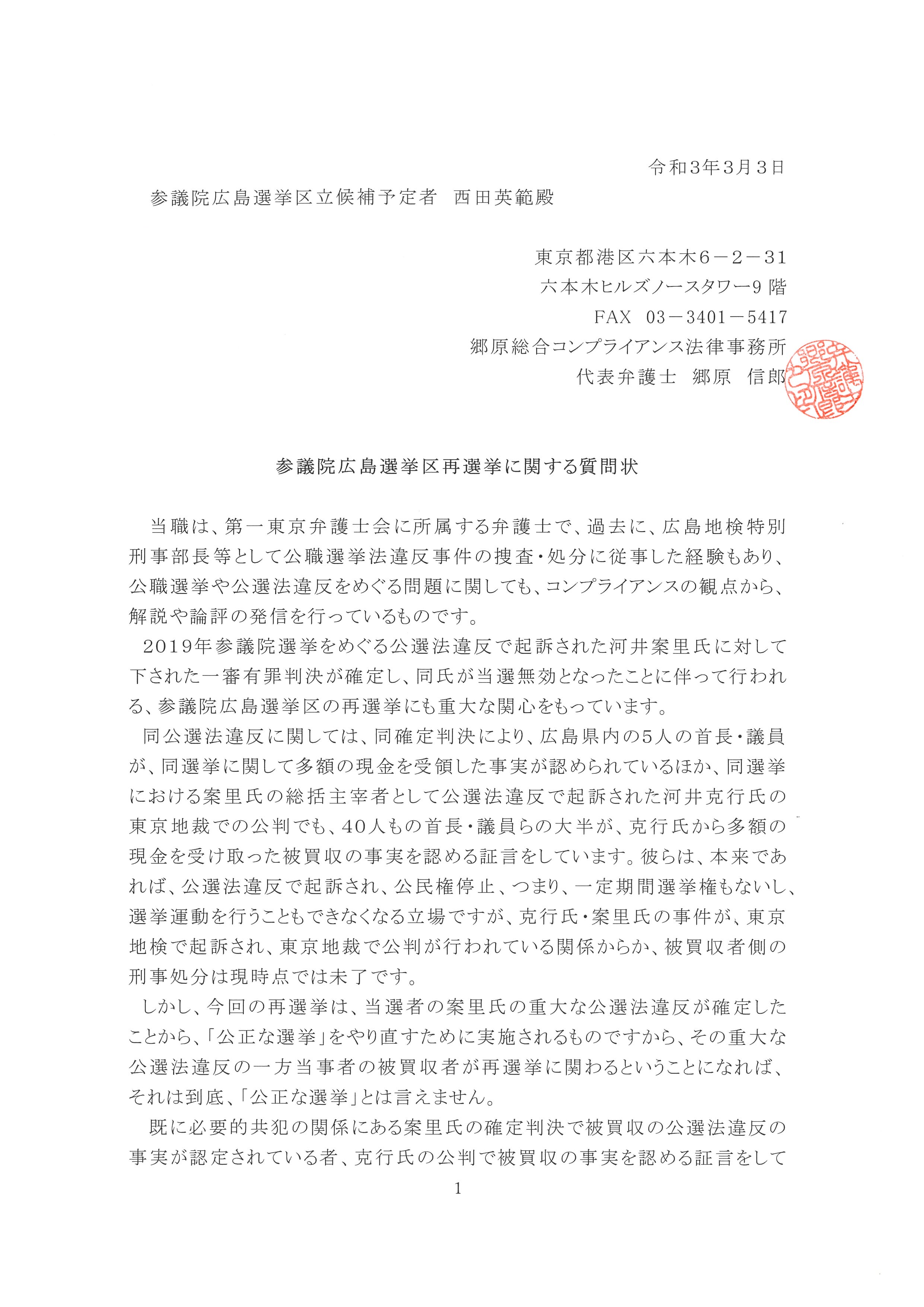 西田英範氏に、参院広島再選挙で、「不正選挙」を正す意思はあるのか?